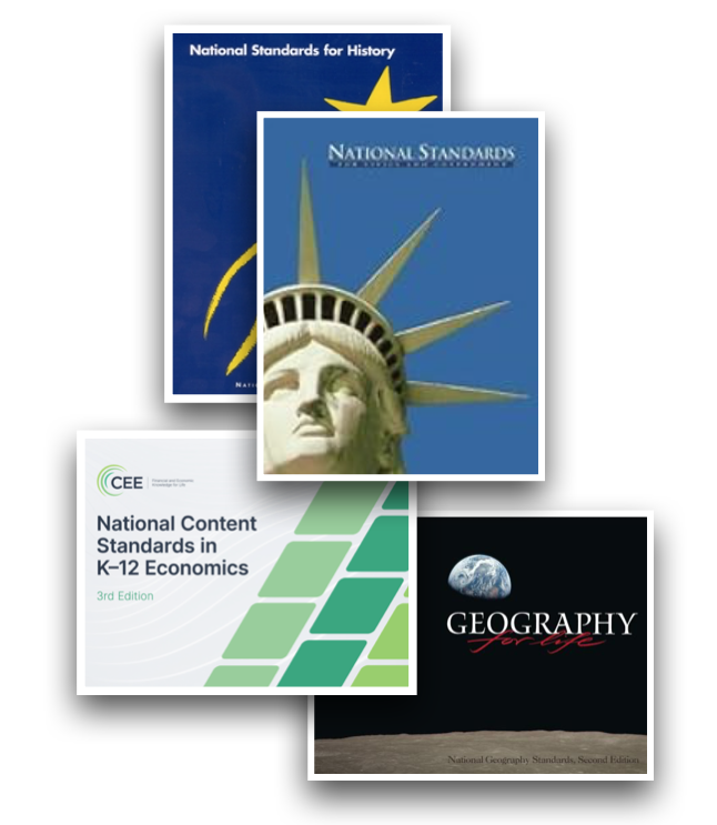 Many states have content standards for history, civics, and economics, and geography. However, we have found that several states lack adequate social studies content standards, especially in history. For states that lack sufficient content standards, we fall back on national content standards for a given subject: